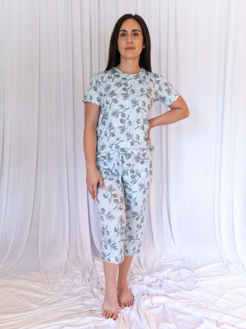 Cozy Blue Pine Cone Short Sleeve Pajama Capris Set