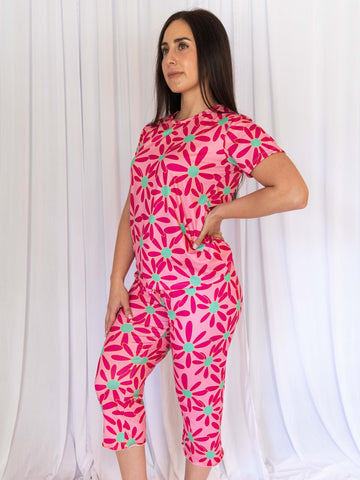 Cozy Pink Daisy Short Sleeve Pajama Capris Set