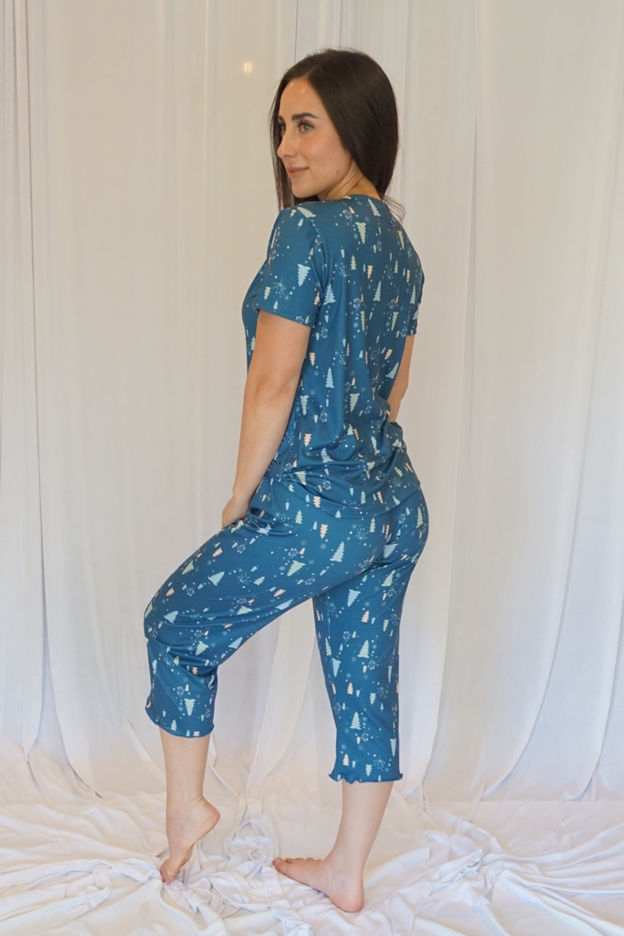 Cozy Christmas Blue Short Sleeve Pajama Capris Set