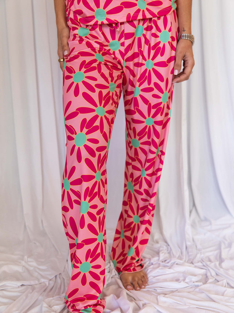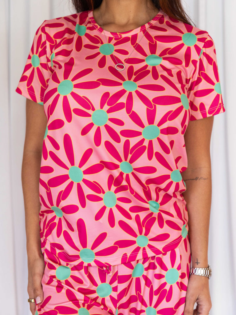Cozy Pink Daisy Short Sleeve Pajama Pant Set
